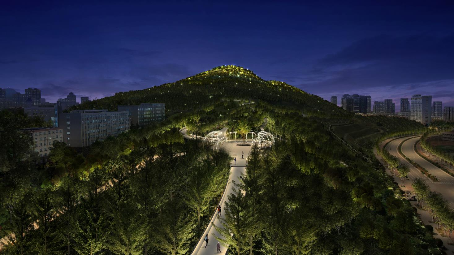 項(xiàng)目范圍包含綢帶公園和東西綠廊(包括五頂茂陵山)開(kāi)放空間景觀,其中綢帶公園南起經(jīng)十路北車(chē)工業(yè)南路,總面積約 556000 平方米,兼顧各視角場(chǎng)景照明效果,展現(xiàn) CBD 商務(wù)區(qū)夜景風(fēng)采改善人民夜間生活環(huán)境。